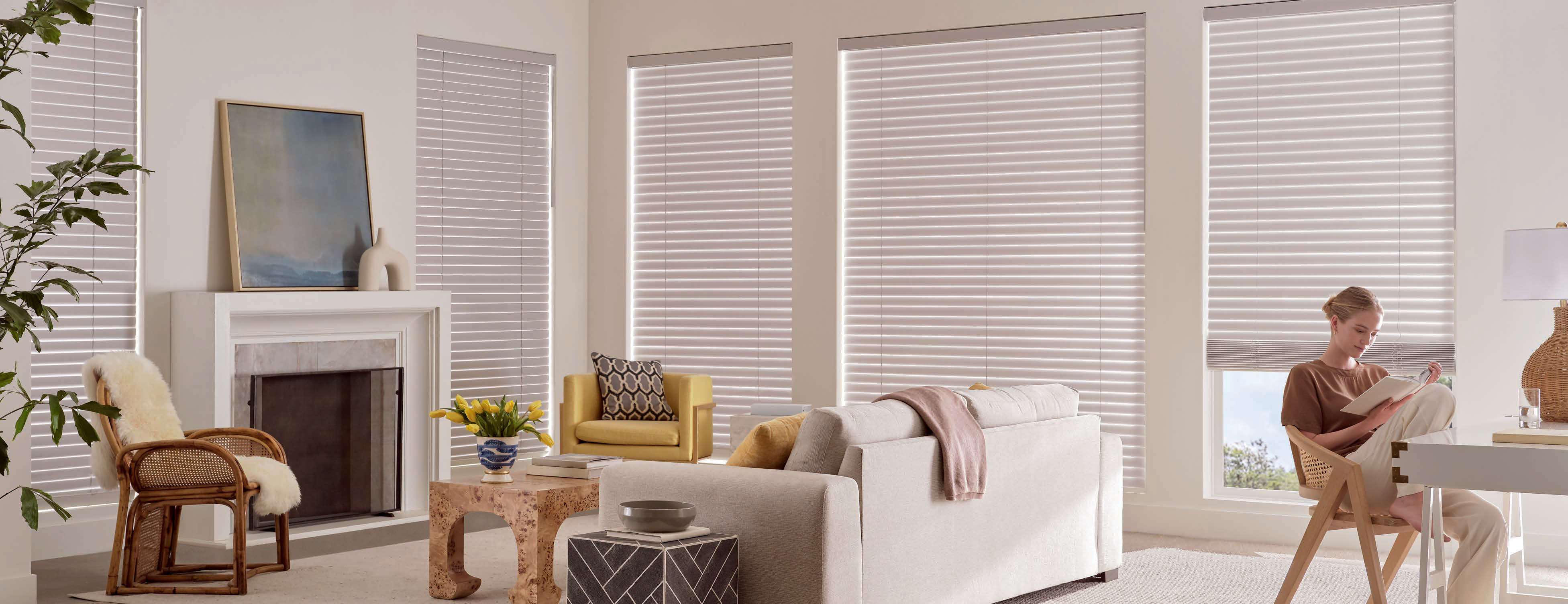 Create a cohesive look in a room with The Whole House Solution™, which pairs horizontal blinds with vertical solutions.