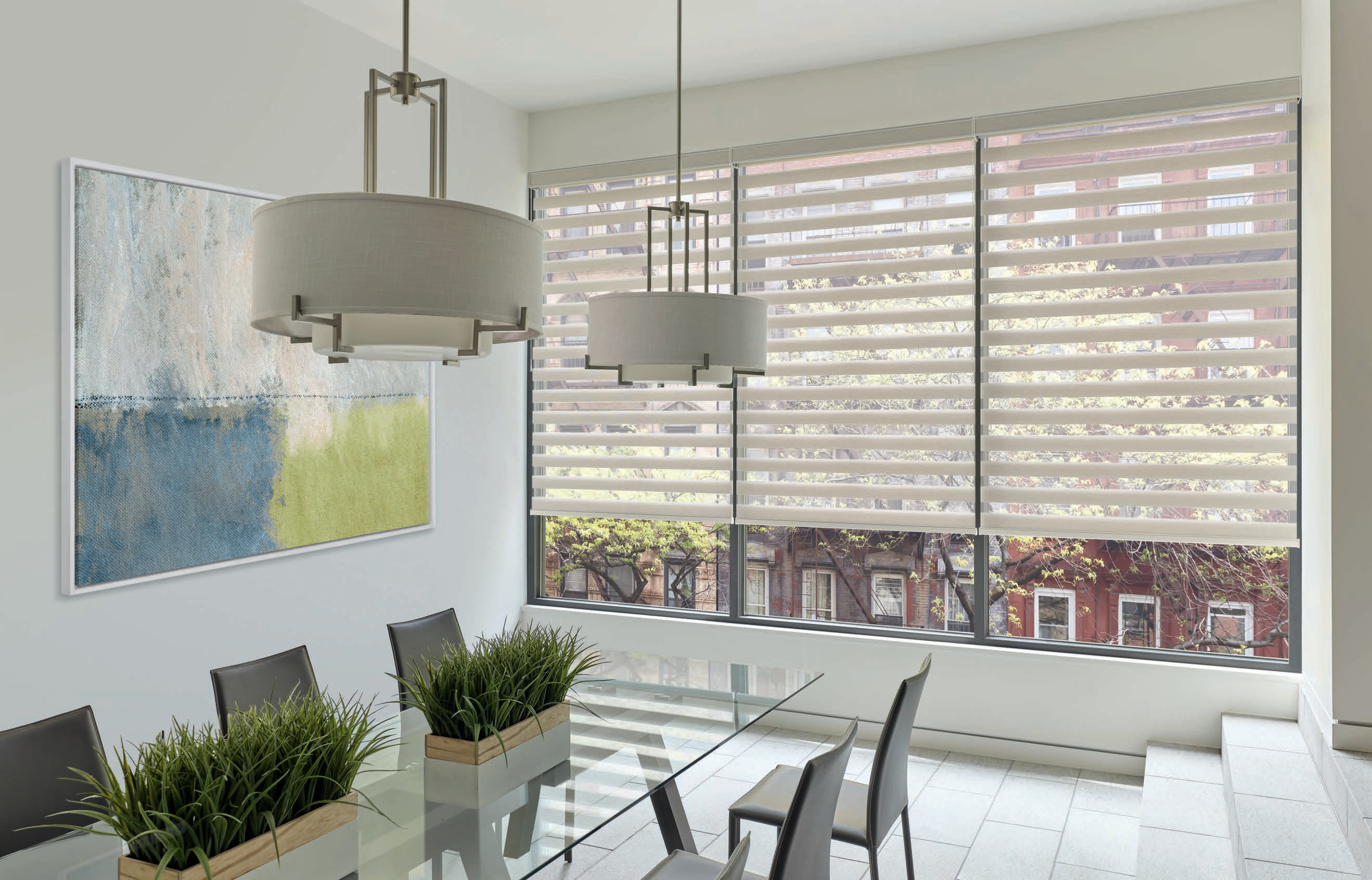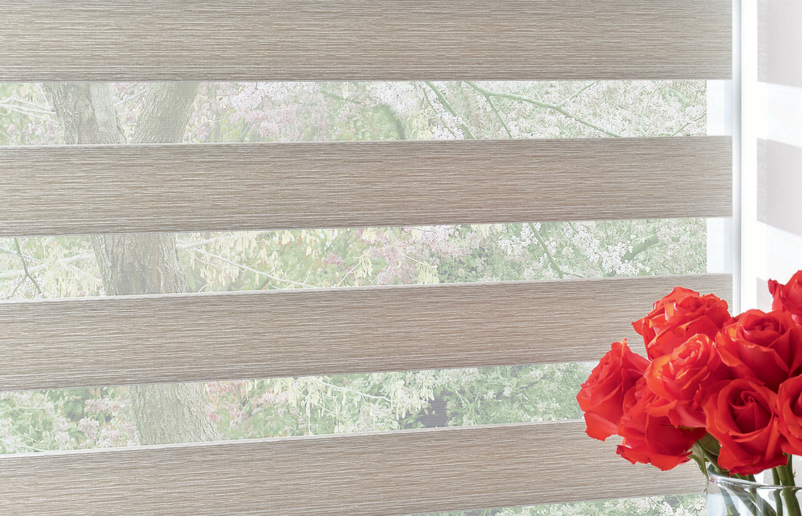 Designer Banded Shades combine sheer and solid alternating fabric bands into a single shade. This unique design allows the shade to transition from open to closed seamlessly, providing a modern solution for view-through, light control and privacy.