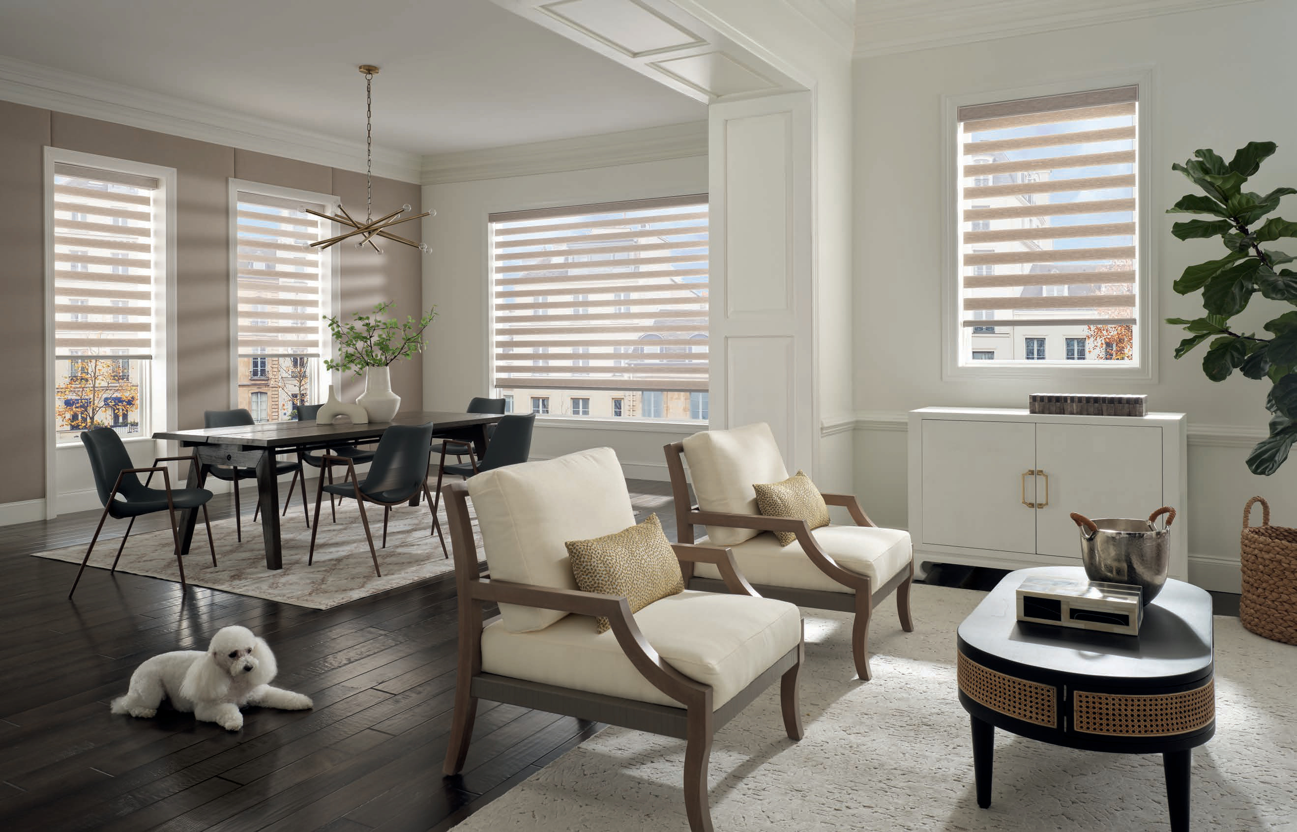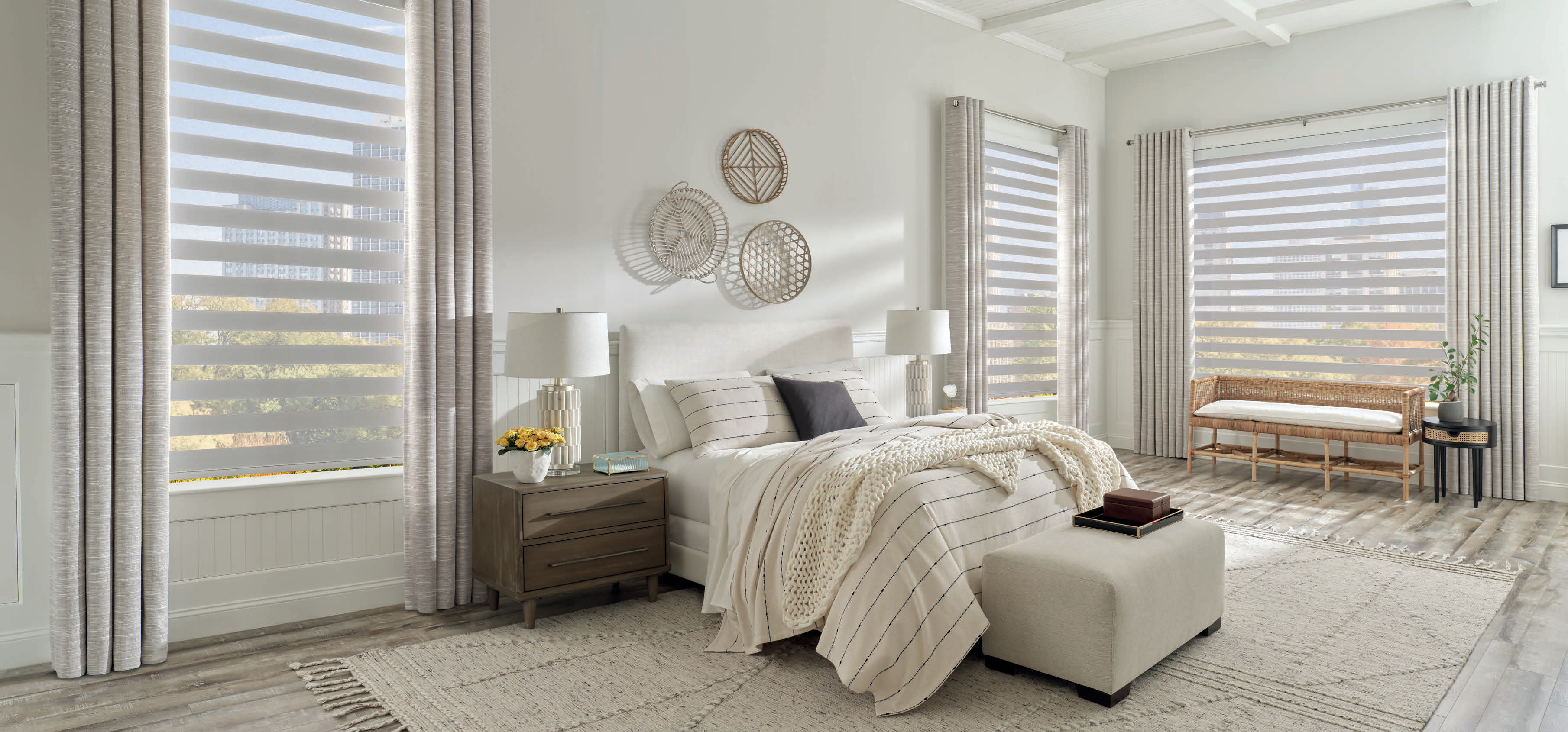 Designer Banded Shades combine sheer and solid alternating fabric bands, available in light-filtering and light-dimming styles for easy selection of the opacity that fits your light control needs.